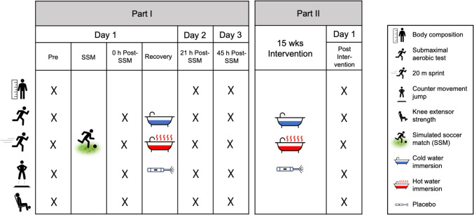 Methods: For Part I, 40 male soccer players (15-19 years) were randomized to either CWI (10 °C, 10 min), HWI (42 °C, 20 min), or placebo (6 min, sham laser), applied after a 90 min simulated soccer match (SSM). Physical performance was assessed using submaximal aerobic, 20 m sprint, countermovement jump (CMJ), and knee extension strength tests [i.e., maximum voluntary isometric contraction (MVIC) and time to exhaustion (TTE) at 60% of MVIC] performed at Pre-SSM and 0, 21 and 45 h Post-SSM. For Part II, 19 participants applied their respective recovery modality (~ twice a week) in their usual training. After 15 weeks, physical performance and body composition were assessed and compared to pre-intervention.