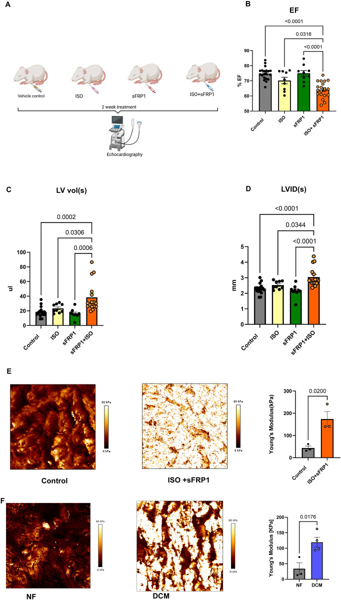 Methods: The effect of sFRP1 in combination with isoproterenol (ISO) (to recapitulate the increase in circulating catecholamine observed in paediatric iDCM) was evaluated in neonatal rat ventricular myocytes (in vitro), and in neonatal rats through intraperitoneal injections (in vivo). Function and molecular mechanisms were investigated through echocardiography and next-generation-sequencing. Protein levels and localization were determined by Western blot. Tissue stiffness was measured by Atomic Force Microscopy. In vitro and in vivo data were compared to explanted human heart tissue.