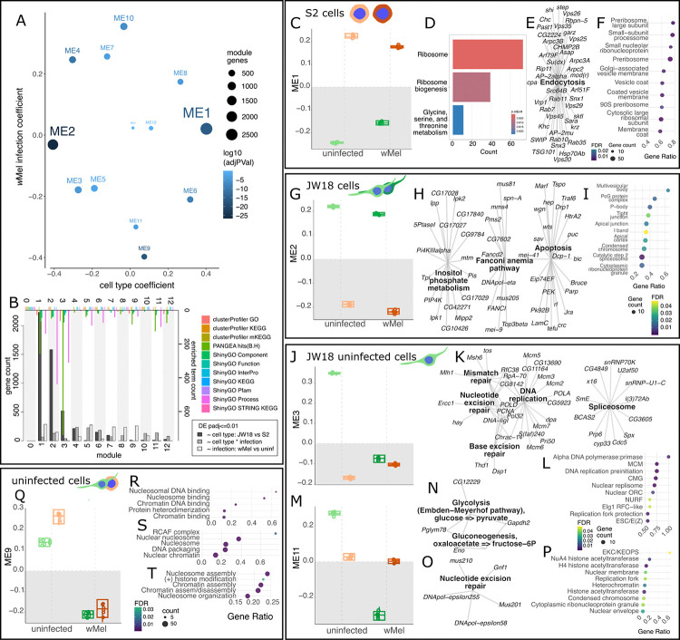 Many host-associated bacteria influence the differentiation of their eukaryotic host cells. The association between Wolbachia pipientis and Drosophila melanogaster offers a model for understanding how host-microbe gene expression co-evolves. Using Wolbachia-infected Drosophila cell lines, we show that the wMel strain alters host cell states, inducing novel gene expression programs that diverge from known cell types. Transcriptomic co-expression network analysis identified gene expression modules specific to each cell type and infection state, and revealed that wMel tailors its gene expression to host context. In macrophage-like host cells, wMel expresses pathogenic effectors, whereas in neuron-like cells, wMel upregulates metabolic genes. Micro-C chromatin contact data revealed that many of these infection-induced changes are epigenetically encoded, with wMel infection conferring reduced chromatin contacts and widespread transcriptional derepression in D. melanogaster. These findings show that the nature of Wolbachia symbiosis-mutualistic or pathogenic-emerges from host cell environments and suggest new paths for engineering host-specific microbial phenotypes.