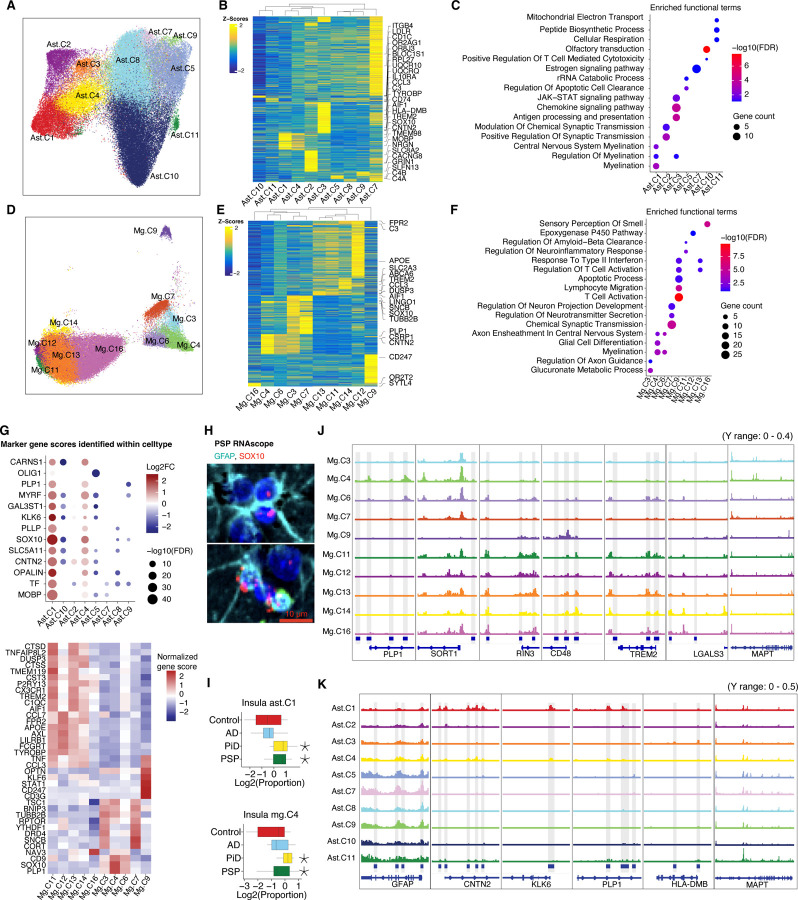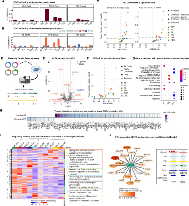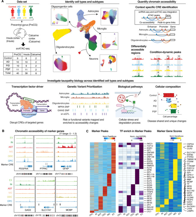 The accumulation of abnormal tau protein selectively affects distinct brain regions and specific populations of neurons and glial cells in tau-related dementias, such as Alzheimer's disease (AD), Pick's disease (PiD), and progressive supranuclear palsy (PSP). Although the three disorders share the feature of tau protein pathology, the regulatory circuitry of non-coding genetic variants underlying risk-associated cell states remains to be elucidated. Using paired single-nucleus profiling of chromatin accessibility and gene expression across AD, PiD, and PSP, we define cell-type-specific cis-regulatory elements (CREs) across six cell types and fifty subclasses. Comparing disease-dynamic CREs across three disorders, we find that glia overrepresent disorder-specific gene regulation related to dynamic cellular response to stress. We show that human genetic variants affecting microglial gene regulation converge into distinct and co-regulated modules affecting specific cellular functions. Moreover, polygenic risk modifiers are maximally co-accessible in disorder-specific glial states, modifying distinct pathways such as sphingomyelin regulation in PiD. Our study informs glial regulators linked to polygenic modifiers of primary tauopathy, introducing modifiable pathways governing resilience for therapeutic consideration.