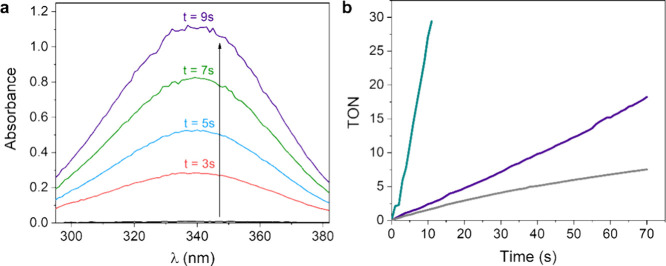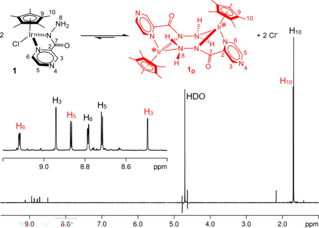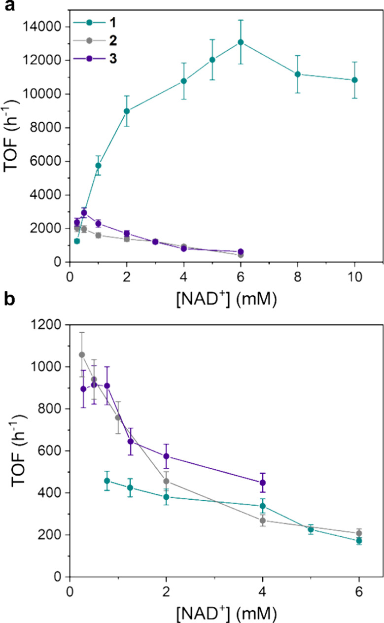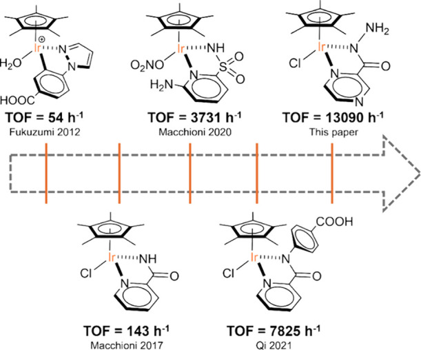 A rational design, based on a deep understanding of the reaction mechanism, led to the development of an iridium organometallic catalyst with activity comparable to that of enzymes in the chemical regeneration of NADH, using phosphite as a reducing agent. The innovative structural elements were individuated in replacing pyridine with pyrazine and adding a carbohydrazide moiety in the bidentate amidate supporting ligand. Resulting [Cp*Ir-(pyza-NH2)-Cl] (pyza-NH2 = κ2-pyrazinecarbohydrazide; 1) outperforms both the analogous complex with pyridine, [Cp*Ir-(pica-NH2)-Cl] (pica-NH2= κ2-pyridincarbohydrazide; 2), and that missing the -NH2 moiety, [Cp*Ir-(pyza)-Cl] (pyza = κ2-pyrazineamidate; 3). A maximum TOF of 13,090 h-1 was observed for 1 ([NAD+] = 6 mM, [cat] = 7.5 μM, pH 6.58 by phosphite buffer 0.4 M, 313 K), a value never reached for any organometallic catalyst and comparable with that of enzymes. 1H diffusion NMR experiments indicate that 1 and 2 undergo dimerization in water through the ionization of the Ir-Cl bond and coordination of the carbohydrazide moiety to a second iridium center. This leads to [Cp*Ir-(pyza-NH2)]2X2 (1 D ) and [Cp*Ir-(pica-NH2)]2X2 (2 D ) that were isolated as PF6 - salts by anion metathesis with NH4PF6 and fully characterized both in solution (multinuclear multidimensional NMR) and in the solid state (single-crystal X-ray diffractometry). Catalytic NADH regeneration experiments were carried out starting from stock solutions of 1-3 complexes in acetonitrile, where diffusion NMR experiments ensure the main presence of mononuclear catalytic precursors, in order to avoid complications due to dimerization. In-depth kinetic studies evidenced that catalyst 1 in combination with the H2PO3 - donor is superior to 2 and 3 in all aspects, facilitating the formation of the Ir-H intermediate and the tendency to donate the hydride to NAD+, at the same time inhibiting the detrimental accumulation of the off-cycle cat/NAD+ adduct. The introduction of the pyrazine moiety, much less σ-donating and more π-accepting than the pyridine one, is likely responsible for most of the increased activity and stability of 1 with respect to 2. Meanwhile, the dandling -NH2 carbohydrazide moiety might further accelerate the process by providing a basic functionality close to the reactive coordination position and introducing some steric hindrance to hamper the formation of the off-cycle cat/NAD+ adduct.