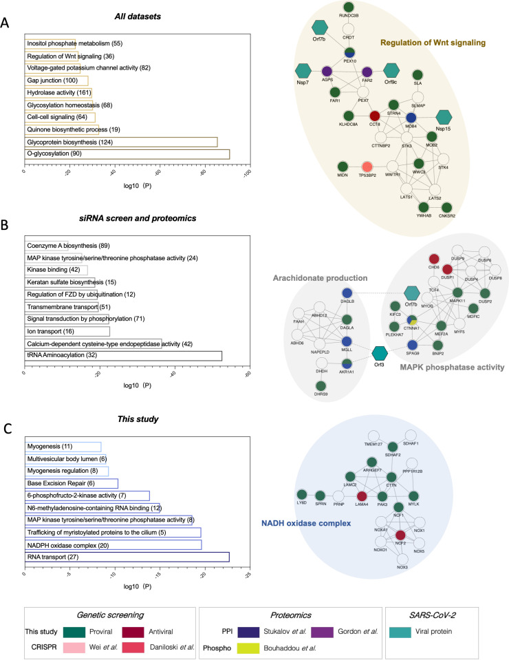 Defining the subset of cellular factors governing SARS-CoV-2 replication can provide critical insights into viral pathogenesis and identify targets for host-directed antiviral therapies. While a number of genetic screens have previously reported SARS-CoV-2 host dependency factors, most of these approaches relied on utilizing pooled genome-scale CRISPR libraries, which are biased toward the discovery of host proteins impacting early stages of viral replication. To identify host factors involved throughout the SARS-CoV-2 infectious cycle, we conducted an arrayed genome-scale siRNA screen. Resulting data were integrated with published functional screens and proteomics data to reveal (i) common pathways that were identified in all OMICs datasets-including regulation of Wnt signaling and gap junctions, (ii) pathways uniquely identified in this screen-including NADH oxidation, or (iii) pathways supported by this screen and proteomics data but not published functional screens-including arachionate production and MAPK signaling. The identified proviral host factors were mapped into the SARS-CoV-2 infectious cycle, including 32 proteins that were determined to impact viral replication and 27 impacting late stages of infection, respectively. Additionally, a subset of proteins was tested across other coronaviruses revealing a subset of proviral factors that were conserved across pandemic SARS-CoV-2, epidemic SARS-CoV-1 and MERS-CoV, and the seasonal coronavirus OC43-CoV. Further studies illuminated a role for the heparan sulfate proteoglycan perlecan in SARS-CoV-2 viral entry and found that inhibition of the non-canonical NF-kB pathway through targeting of BIRC2 restricts SARS-CoV-2 replication both in vitro and in vivo. These studies provide critical insight into the landscape of virus-host interactions driving SARS-CoV-2 replication as well as valuable targets for host-directed antivirals.