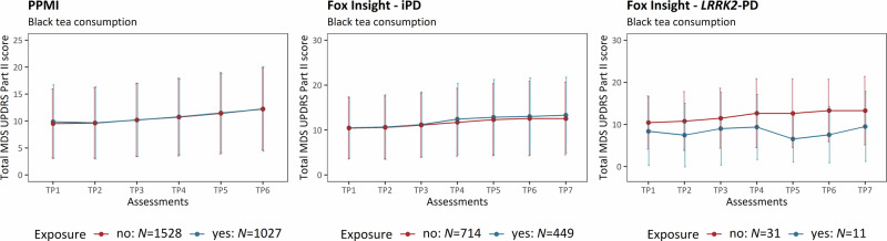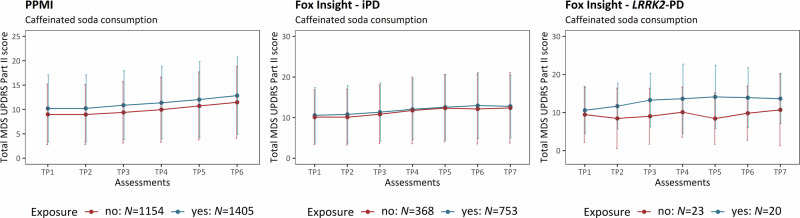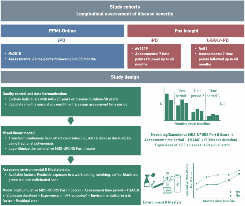 Longitudinal investigations on the relationship between lifestyle exposures and motor severity are lacking. In this longitudinal study, we included patients with idiopathic Parkinson's disease (iPD) (N = 5139) and LRRK2-related PD (N = 81) from PPMI-Online and Fox Insight. Motor aspects were followed for up to five years. We investigated the association between environmental exposure, lifestyle factors and motor aspect severity over time by applying linear mixed effects models. In LRRK2-PD, black tea consumption was associated with less severe motor aspects (β = -0.51, p = 0.028). In patients with iPD, pesticide exposure was associated with more severe motor aspects over time in PPMI-Online (β = 0.23, p = 3.56 × 10-9). Lastly, caffeinated soda was associated with more severe motor aspects in patients with iPD from PPMI-Online (β = 0.15, p = 3.84 × 10-8) and Fox Insight (β = 0.09, p = 0.031). We suggest that pesticide exposure and lifestyle factors may affect motor severity in patients with LRRK2-PD and iPD, demonstrating the impact on patients even after disease onset.