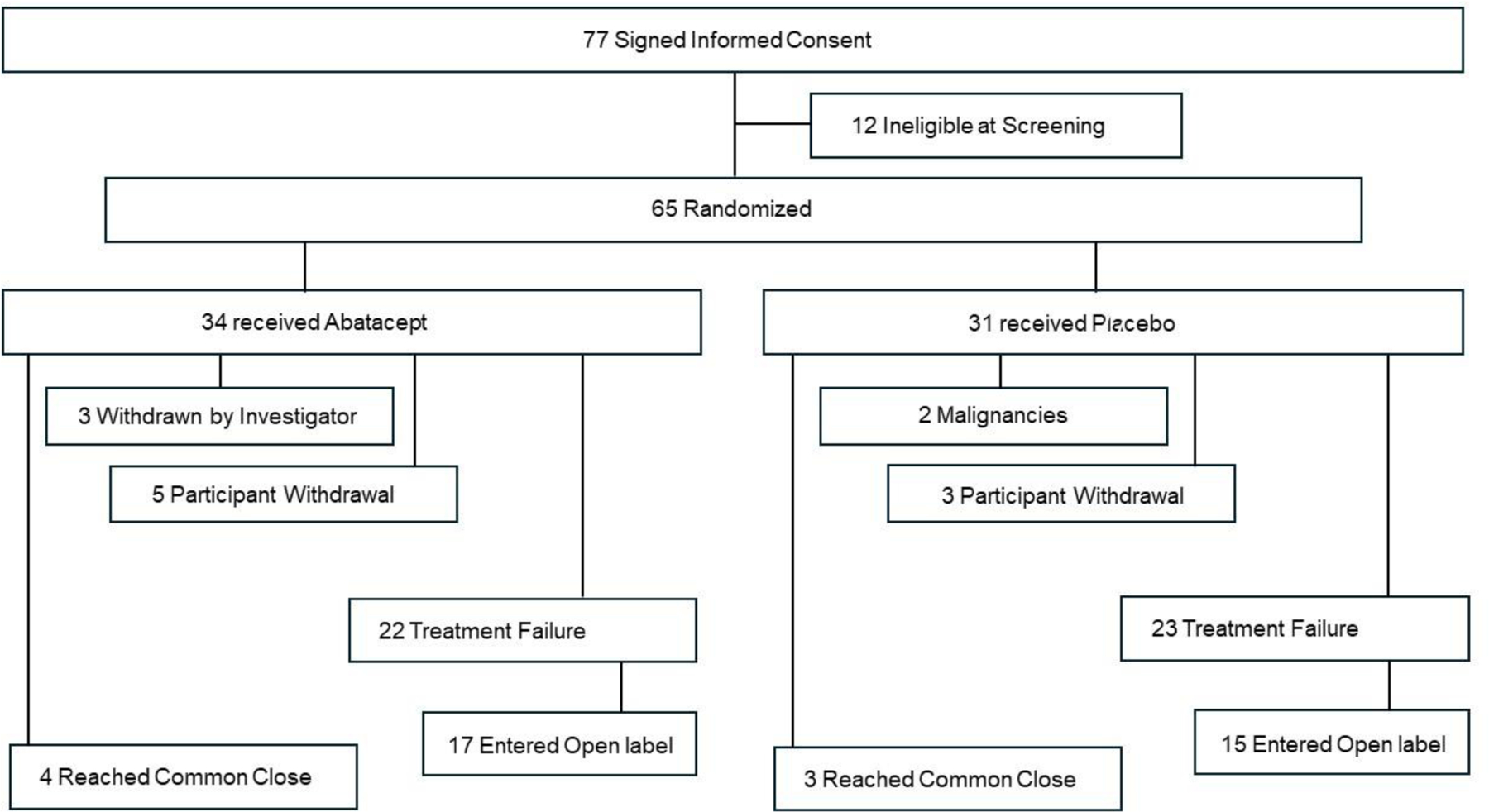Results: Sixty-five patients were randomized; 34 received abatacept and 31 received placebo. No statistical difference in the treatment failure rate was found between those who received abatacept and those who received placebo (P = 0.853). Treatment with abatacept did not demonstrate any statistical difference from placebo in key secondary end points, including time to full remission (BVAS/WG = 0), duration of glucocorticoid-free remission, relapse severity, prevention of damage, and patient-reported quality-of-life outcomes. There was no difference in the frequency or severity of adverse events between treatment arms, including infection.