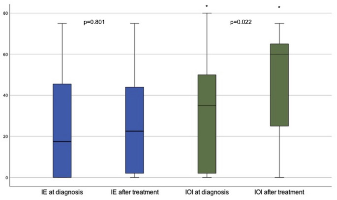 Results: Twenty-six eyes developed IE (mean incidence 0.031%) after IVI and 24 eyes were diagnosed with NI-IOI (mean incidence 0.028%), including anterior plus intermediate uveitis (n = 18), only vitritis (n = 4) and retinal vasculitis (n = 2). Regarding NI-IOI, eyes were under treatment with aflibercept (n = 12), bevacizumab (n = 11) and faricimab (n = 1). The most common initial presentation was a painless decrease in visual acuity (VA) at a mean of 8 days [1-20] after IVI in patients with NI-IOI versus red eye, pain and blurry vision, at a mean of 3 days [1-9] after IVI in the IE group. There was a significant improvement in VA between the NI-IOI diagnosis and final visits (35 ± 25 vs. 49 ± 24 ETDRS letters) in the NI-IOI group (p = 0.022), an improvement that occurred over a mean of almost 2 months. There were no significant differences between VA at the time of diagnosis and after treatment (25 ± 28 vs. 26 ± 25 ETDRS letters) in the IE group (p = 0.801).
