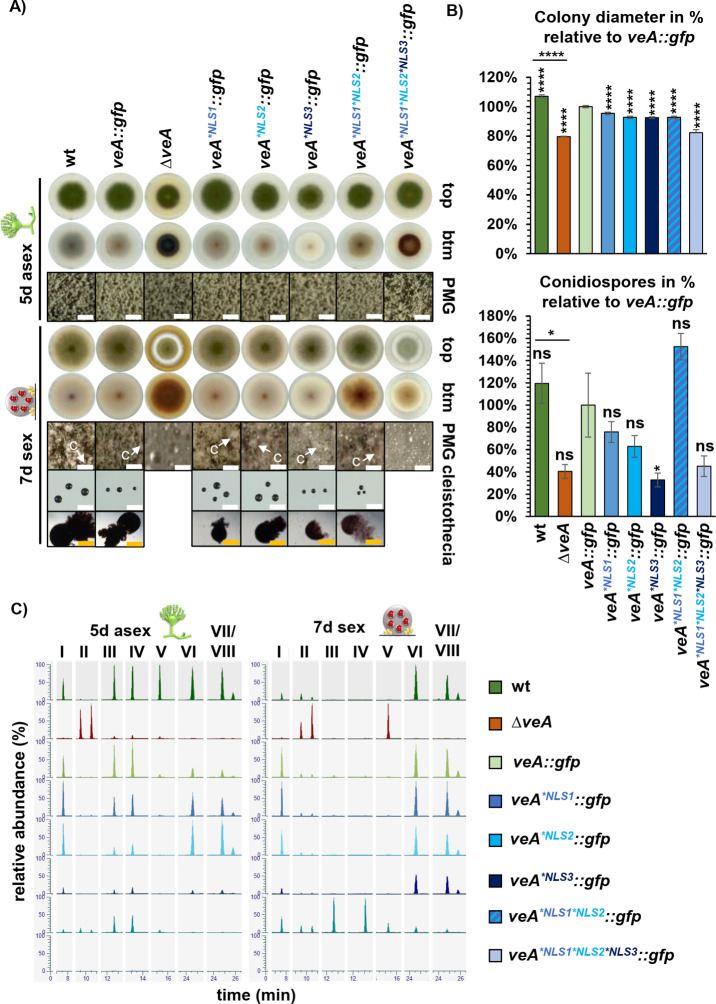 The Aspergillus nidulans velvet domain containing transcription factor VeA is shuttled from cytoplasm into nucleus during vegetative growth and stays there for sexual development, but has to return into cytoplasm for asexual development
