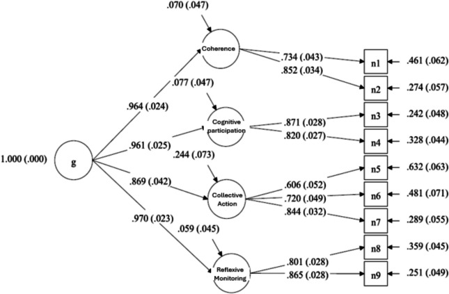 Methods: A cross-sectional survey was conducted with 328 healthcare personnel (74.% clinicians) participating in the Improving the Management of SymPtoms during And following Cancer Treatment (IMPACT) Research Consortium between 2019 and 2024. Confirmatory factor analysis (CFA) tested the hypothesized four-factor structure (coherence, cognitive participation, collective action, reflexive monitoring). Internal consistency was assessed with McDonald's omega and Cronbach's alpha coefficients (> 0.70 acceptable). Measurement invariance was tested across research centers, professional roles, and years in current roles using multi-group CFA. Model fit was defined by standard fit indices (Comparative Fit Index (CFI) and Tucker-Lewis Index (TLI) values ≥ 0.95, Root Mean Square Error of Approximation (RMSEA) values ≤ 0.06, and Standardized Root Mean Square Residual (SRMR) values ≤ 0.08. Differential item functioning (DIF) was evaluated using ordinal logistic regression and item response theory methods (ΔR2 ≥ 0.02 indicative of meaningful DIF).