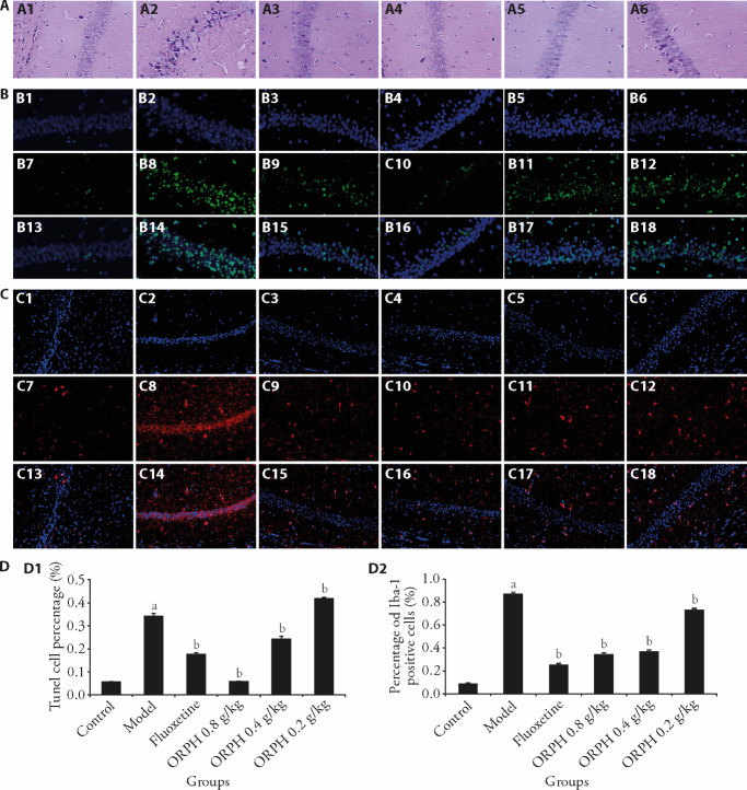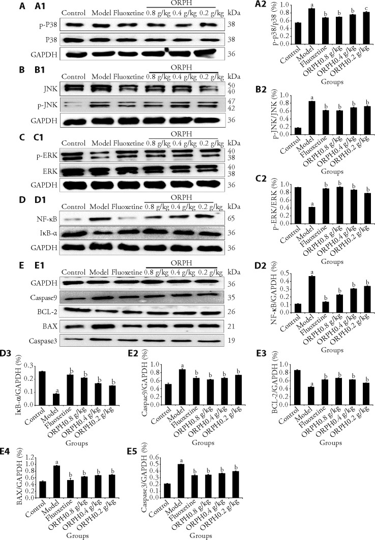 Results: ORPH improved depression-like behavior, ameliorated brain tissue damage and apoptosis, and inhibited microglia activation in brain tissue in mice. In addition, ORPH reduced expression of B-cell lymphoma-2 (Bcl-2)-associated X (Bax), cysteinyl aspartate specific proteinase 3 (Caspase3), cysteinyl aspartate specific proteinase 9 (Caspase9), nuclear factor- kappa B (NF-κB), phosphorylation-p38 (p-p38), phosphorylation-Jun N-terminal kinase (p-JNK) proteins, and increased expression of Bcl-2, inhibitory kappa B alpha (IκB-α), phosphorylation-extracellular regulated protein kinases 1/2 (p-ERK1/2) proteins. On the other hand, there were fewer Iba-1-positive cells, lower expression of NF-κB, p-p38, p-JNK and p-ERK1/2 proteins, and higher expression of IκB-α proteins in BV2 cells in the ORPH group. In addition, ORPH increased 5-hydroxytryptamine, norepinephrine levels and decreased CORT, interleukin-1β (IL-1β), interleukin -6 (IL-6), tumor necrosis factor-α (TNF-α) levels.