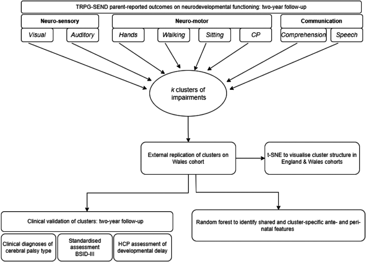 Findings: Four homogeneous clusters were derived (silhouette score = 0.71) and replicated in Wales with high balanced accuracy (93%): (1) typically developing (84.8%), (2) communication impairments (8.4%), (3) neuro-motor impairments (4.1%), and (4) multiple neuro-morbidity (2.7%). Clusters had high clinical validity and were distinguishable by shared and cluster-specific predictors. Neonatal brain injuries were most predictive of neuro-motor and multiple neuro-morbidity clusters. Birthweight, gestational age, socio-economic deprivation, and sex were stronger predictors of the communication cluster than preterm co-morbidities.