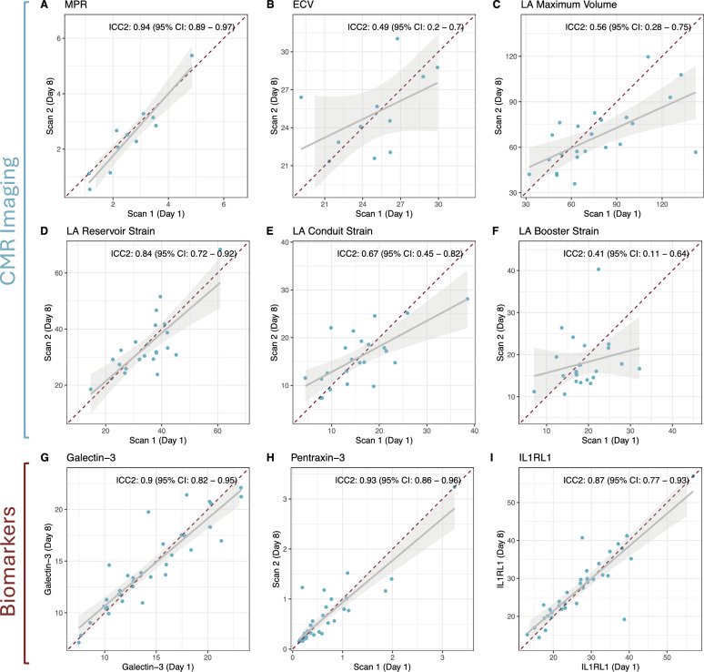 Results: In multivariable regression, impaired measures of LA structure and function emerged as the only independent discriminators of HFpEF, with LA maximum volume showing an OR of 1.13 (95% CI 1.05-1.28), reservoir strain of 0.71 (95% CI 0.44-0.89), conduit strain of 0.57 (95% CI 0.32-0.82) and booster strain of 0.70 (95% CI 0.48-0.89) per unit increase. No differences in MPR nor ECV were observed between the groups. While serum biomarkers Galectin-3 and Pentraxin-3 were significantly higher in HFpEF vs. obese controls (16.1 ng/ml ± 3.8 ng/ml vs. 10.6 ng/ml ± 3.7 ng/ml, p = 0.011, and 0.84 ng/ml ± 0.67 ng/ml vs. 0.21 ng/ml ± 0.05 ng/ml, p = 0.031, respectively), these biomarkers remained within normal limits and showed only moderate correlations with CMR metrics. Highest inter-study reproducibility was seen in MPR (ICC: 0.94), LA Reservoir Strain (ICC: 0.84) and serum biomarkers (ICC: 0.087-0.93).