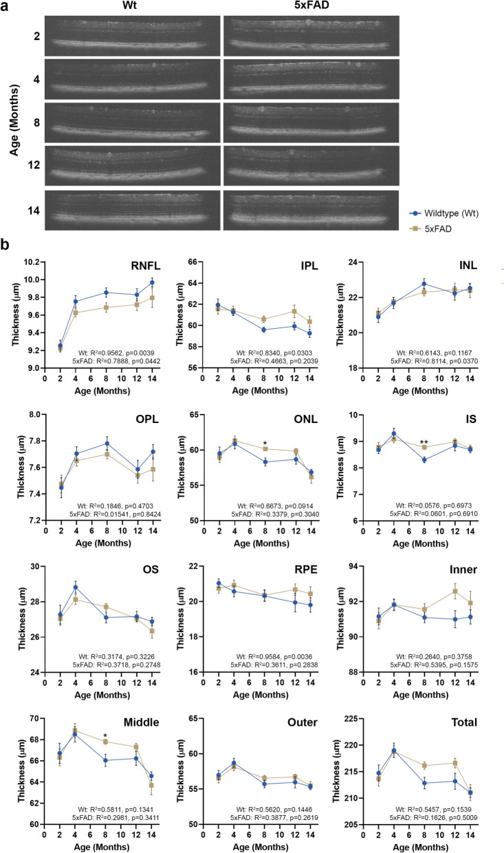 Methods: Mice were genotyped to exclude the retinal degeneration alleles Pde6brd1, Pde6brd8, Agouti, Tyr and Oca2. Retinas of 5xFAD and wildtype littermates (97 males/females in total) were longitudinally assessed until 15 months using non-invasive retinal scans: multi-focal electroretinography, optokinetic tracking, optical coherence tomography (OCT), colour fundus photography and fluorescein angiography. Mice were killed at 4, 8 and 15 months, and eyes enucleated for analyses by light, confocal and electron microscopy.
