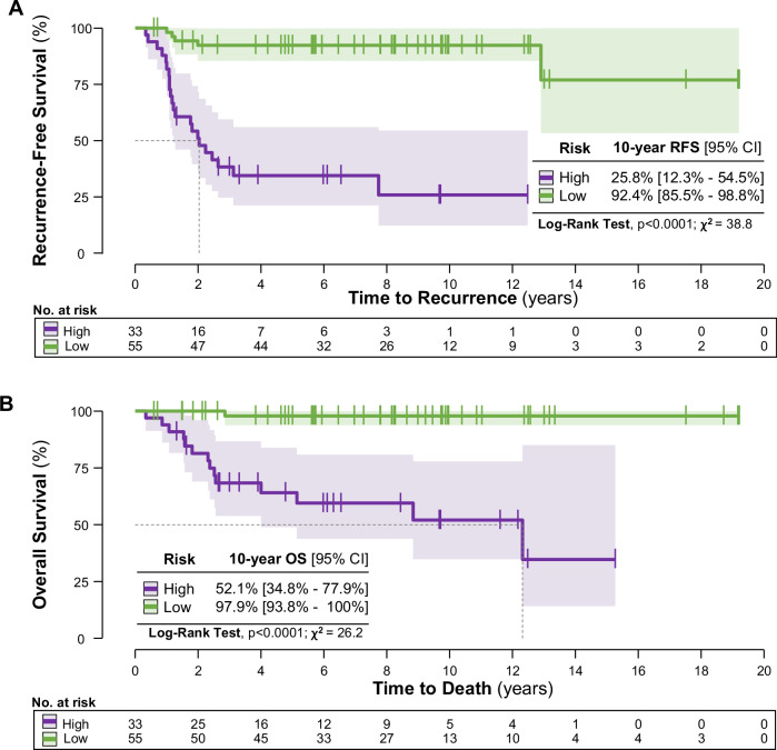Survivors of early-onset colorectal cancer (EOCRC, i.e., diagnosed before age 50) are likely to experience recurrence after completing treatment. In this international, multi-centric, phase I-II-III EDRN biomarker study, we identified a panel of tumor-derived biomarkers of EOCRC recurrence. We then trained and independently validated a machine learning model (XGBoost) to predict 5-year recurrence-free and overall survival (RFS and OS) of patients with stage I-III EOCRC. Patients with "low-risk" EOCRC demonstrated statistically higher rates of 2-, 5-, and 10 year RFS in both the training cohort (51.0 vs. 92.4%; 34.4% vs. 92.4%; 25.8% vs. 92.4%, respectively; p < 0.0001) and the validation cohort (78.9% vs. 100.0%; 75.0% vs. 100.0%; 75.0% vs. 100.0%, respectively; p = 0.0019). We also report a significant reduction in both over-treatment and missed recurrences compared to current clinically available options. This tissue-based, machine learning-powered assay was prognostic of long-term RFS and OS outcomes after curative-intent treatment of EOCRC (ENCORE was first registered on ClinicalTrial.gov [ID: NCT06271980] on February 15th, 2024).