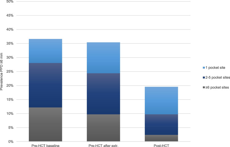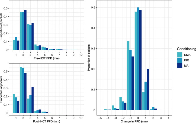 Results: HCT recipients had a median age of 59 years (IQR 48-66); 63% were male. Median time to HCT was 53 days (IQR 29-89), median follow-up was 279 days (IQR 183-349). Severe periodontitis (≥ 1 site with PPD ≥ 6 mm) was observed in 37% of patients pre-HCT and 20% of patients post-HCT. PPD, BOP, PESA and PISA decreased from pre- to post-HCT, by 0.26 mm [95%CI 0.16;0.37], 8% [95%CI 5;12], 140 mm2 [95%CI 89;190] and 123 mm2 [95%CI 83;185], respectively. Prevalence of severe periodontitis decreased from pre- to post-HCT in all groups: NMA 50% to 27%, RIC 32% to 19%, MA 31% to 13%. Conditioning intensity was statistically significantly associated with post-HCT PPD and PESA; however, differences were small. No statistically significant differences were observed in post-HCT PISA between conditioning regimens.