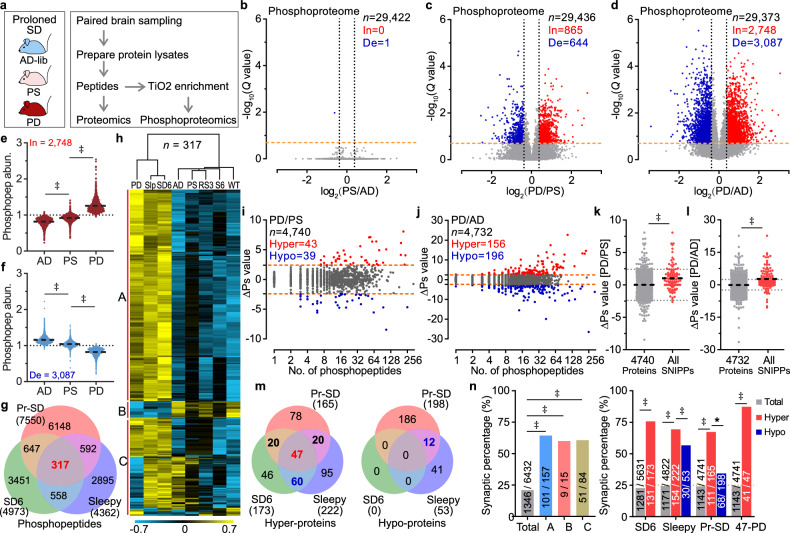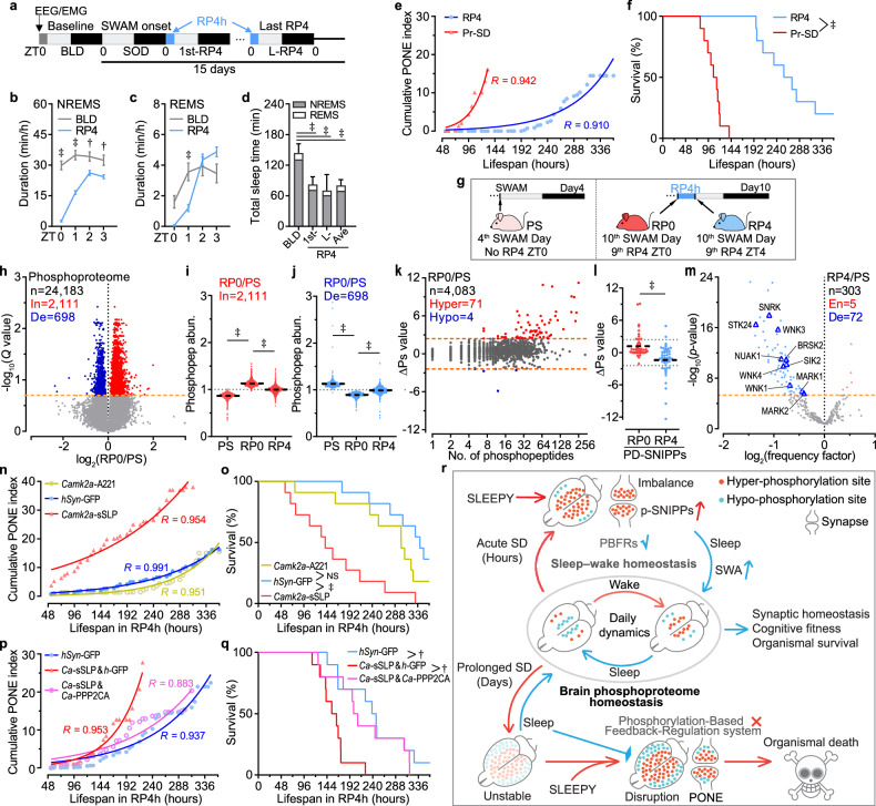 Prolonged sleep deprivation (Pr-SD) causes death in many species. While various mechanisms related to sleep regulation or this fatal consequence of sleep loss have been identified, the core molecular basis linking Pr-SD-induced lethality and sleep homeostasis remains unknown in mammals. A critical "point of no return (PONE)" status in Pr-SD subjects is highlighted in classic research, and characterizing PONE status could help uncover this mystery. Using a Pr-SD model and a reliable PONE status prediction method, we show that mice in PONE exhibit an inability to enter natural sleep, and significant disruptions in brain phosphoproteome, independent of deprivation time but closely linked to PONE status. Brain kinase or phosphatase dysfunction influences PONE status development and leads to corresponding sleep aberration concurrently. Daily 80-min recovery sleep significantly delays PONE onset and restores brain phosphoproteome. The harmful effects of excessive kinase activity on PONE development can be eliminated by combining recovery sleep and compensatory phosphatase expression. We conclude that sleep is crucial for maintaining brain phosphoproteome homeostasis, whose disruption may impact both Pr-SD-induced lethality and sleep regulation.
