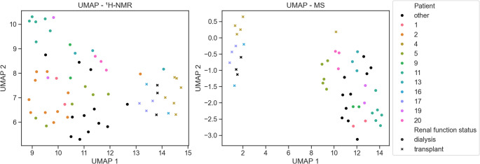 Results: Dialysis patients and transplant recipients differed significantly in their renal cyst fluid metabolomes. The former exhibited higher concentrations of myoinositol, creatinine, sucrose, τ-methylhistidine, trigonelline, and sarcosine, while the latter showed increased levels of leucine, isoleucine, valine and alanine. Remarkably, metabolites of the immunosuppressive prodrug mycophenolate mofetil were detected in renal cyst fluids after kidney transplantation. Despite intra- and interindividual variability, cyst fluid from the same patient displayed greater homogeneity. Interestingly, metabolomic profiles were not altered by cyst size.