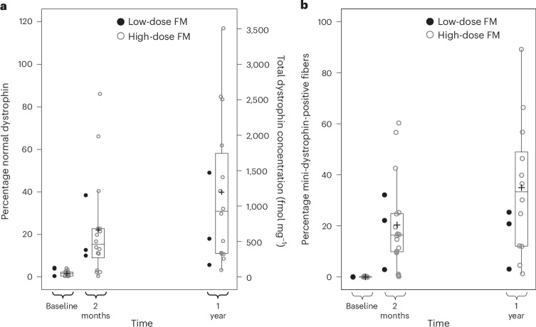 Gene therapy represents a promising approach for Duchenne muscular dystrophy (DMD), a rare X-linked genetic muscle disease. Fordadistrogene movaparvovec (PF-06939926) is an adeno-associated virus serotype 9 gene therapy containing a miniaturized dystrophin being developed for DMD, which aims to restore functional protein to muscle. We present 1-year data from ambulatory and nonambulatory participants in a phase 1b, multicenter, single-arm, open-label trial. Pediatric ambulatory male participants with a genetic DMD diagnosis and receiving stable glucocorticoids received a single intravenous low-dose (n = 3) or high-dose (n = 16) fordadistrogene movaparvovec. The primary endpoint was safety and tolerability at 1 year after dosing. In the ambulatory group, mean ± s.d. age at dosing was 8.6 ± 1.6 years. The most common treatment-emergent adverse events in the ambulatory group were vomiting (n = 15), nausea (n = 10), thrombocytopenia (n = 9), pyrexia (n = 9), decreased appetite (n = 8), fatigue (n = 7) and headache (n = 7). Three treatment-related serious adverse events occurred after dosing (dehydration, acute kidney injury, thrombocytopenia; all resolved within 15 days). In a small nonambulatory group (n = 3), mean ± s.d. age at dosing was 15.1 ± 1.0 years. The most common treatment-emergent adverse events were nausea (n = 3), vomiting (n = 3) and headache (n = 3); two severe treatment-related adverse events (hemolytic uremic syndrome and fatal cardiogenic shock) were observed. In the high-dose ambulatory group, the secondary endpoint of mini-dystrophin quantification showed robust expression. Mean (95% confidence interval) percent of mini-dystrophin-positive fibers for baseline, 2 months and 1 year were 0.1% (0.1-0.2), 20.3% (12.2-29.3) and 34.8% (21.1-49.8), respectively. At the 1-year time point of primary completion, fordadistrogene movaparvovec demonstrated an acceptable safety profile in the ambulatory population. Larger trials are needed to assess the efficacy of the gene therapy in DMD. ClinicalTrials.gov registration no. NCT03362502 .