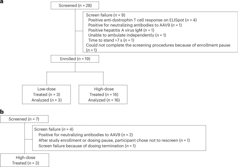 Competing interests: R.J.B. has received support from or has served as a consultant for Sarepta Pharmaceuticals, Scholar Rock, AveXis, Pfizer, Biogen, Reata and Aavanti. P.B.S. has received contracted research support from Pfizer; his institution has received contracted research funding from Sarepta, Solid Biosciences, ReveraGen, PTC Therapeutics, Astellas Gene Therapies, Novartis Gene Therapies, Santhera, Biogen, AMO Pharma and Sanofi. He has served on advisory boards for Sarepta, Alexion, Argenx, Biogen and Genentech, and has received speaker fees from Alexion, Catalyst, Grifols, Genentech, CSL Behring, Biogen and Argenx. H.L., K.A.R., M.D., S.N., D.I.L. and P.F.S. are employees of Pfizer and hold stock or stock options. M.B. and T.G.M. were employees of Pfizer and held stock or stock options at the time of the study. M.B. and T.G.M. are also named on a patent (no. WO2020261178A1) applied for ‘Methods of treating Duchenne muscular dystrophy using AAV mini-dystrophin gene therapy’ but receive no direct financial benefit. B.A.B. (currently retired) was an employee of Pfizer at the time of the study. E.C.S. has received partial salary support from Pfizer for his role as the principal investigator of the study and has served as a paid consultant for Pfizer, Sarepta, NSPharma, Lilly, REGENXBIO, Entrada, Solid Biosciences and Edgewise Therapeutics.