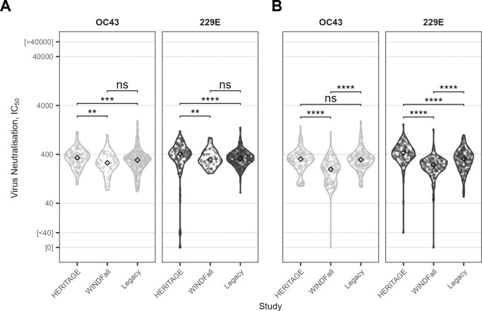 Findings: We found that across all sites most participants had detectable neutralising antibody titres against JN.1 and XEC - the predominant variants in 2024. There were site-related differences in immunity: vaccine-included SARS-CoV-2 strains were better neutralised by participants from the Legacy study - Ancestral, BA.5, XBB.1.5 initially, and JN.1 after a homologous booster in autumn 2024. For HERITAGE, neutralisation of both alpha- (HCoV-229E) and beta-coronaviruses (HCoV-OC43) was higher than WINDFall suggesting a cross-coronavirus serological response in West Africa. Finally, antigenic cartography identified two distinct antibody landscapes, with JN.1 and XEC antigenically distant in Legacy, but not in HERITAGE and WINDFall.