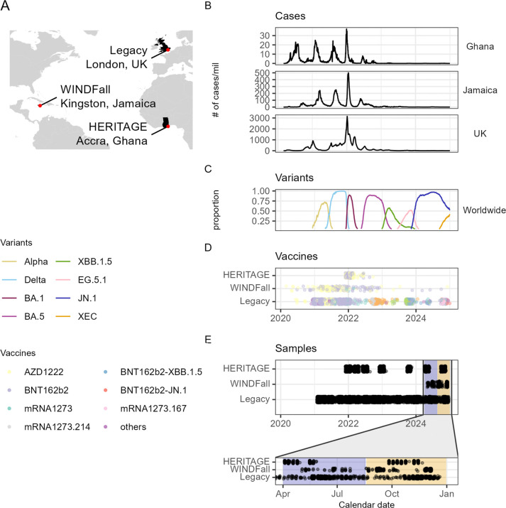 Methods: The WWW Consortium harmonises across the HERITAGE (Accra, Ghana), WINDFall (Kingston, Jamaica) and Legacy (London, UK) studies, establishing sharing frameworks for samples, metadata, and data; related permissions and oversight; and associated physical and cloud infrastructure. With centralised testing, we performed serological assessments across all three locations at two snapshots in 2024 (April 1st - August 18th; August 19th - December 31st) using high-throughput live virus neutralization and anti-nucleocapsid IgG, including n=763 individuals.