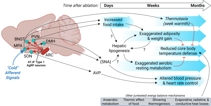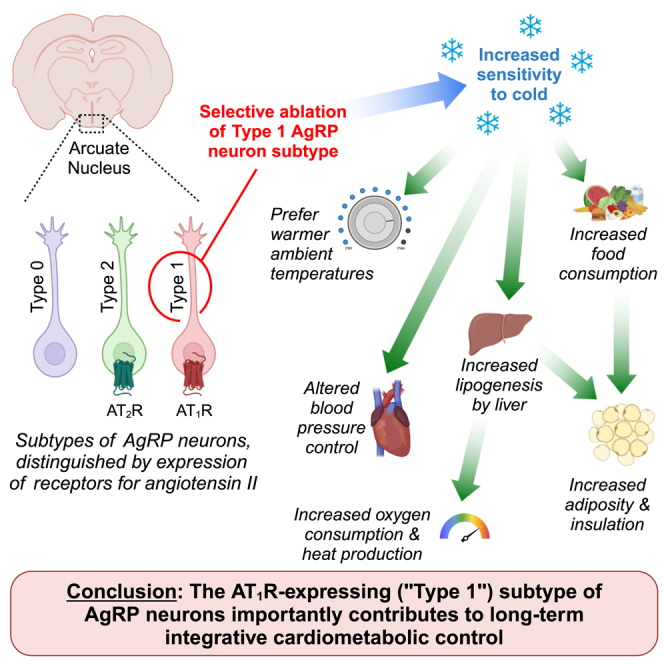 Subtypes of agouti-related peptide (AgRP) neurons can be distinguished based upon expression of angiotensin II receptors. The type 1 subtype, which expresses the angiotensin type 1 receptor (Agtr1a), was examined for its role in the integrative control of cardiometabolic functions. Mice expressing Cre-recombinase via the Agtr1a locus received bilateral microinjection of an AAV vector encoding Cre-dependent expression of caspase-3 into the arcuate nucleus of mice housed at 22°C or 30°C. Ablation of Agtr1a + cells caused increased food intake, adiposity, resting metabolic rate and shifts in nutrient partitioning, elevated temperature preference, loss of core temperature defense, and changes in blood pressure and heart rate. Many phenotypes were ameliorated by housing animals at thermoneutrality. Thus, Agtr1a + cells in the ventral hypothalamus (including the type 1 AgRP neuron) influence cardiometabolic control through modulation of thermoregulatory responses to cold. Some functions of these cells appear to oppose canonical roles of other AgRP neuron subtypes.