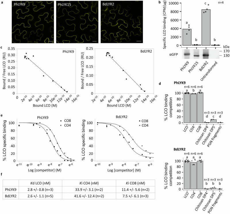 Lipo-chitooligosaccharides (LCO) and short-chain chitooligosaccharides (CO) are produced by arbuscular mycorrhizal fungi (AMF) and activate the plant symbiosis signalling pathway, which is essential for mycorrhiza formation. High-affinity LCO receptors belonging to the LysM receptor-like kinase (LysM-RLK) phylogenetic group LYR-IA play a role in AM establishment, but it is unclear which proteins are the plant high-affinity short-chain CO receptors. Here we studied members of the uncharacterized LYR-IB group, and found that they show high affinity for LCO, short- and long-chain CO, and play a complementary role with the LYR-IA receptors for AM establishment. While LYR-IB knock out mutants had a reduced AMF colonization in several species, constitutive/ectopic expression in wheat increased AMF colonization. LYR-IB function is conserved in all tested angiosperms, but in most japonica rice a deletion creates a frameshift in the gene, explaining differences in AM phenotypes between rice and other monocot single LYR-IA mutants. In conclusion, we identified a class of LysM-RLK receptors in angiosperms with unique biochemical properties and a role in both LCO and CO perception for AM establishment.