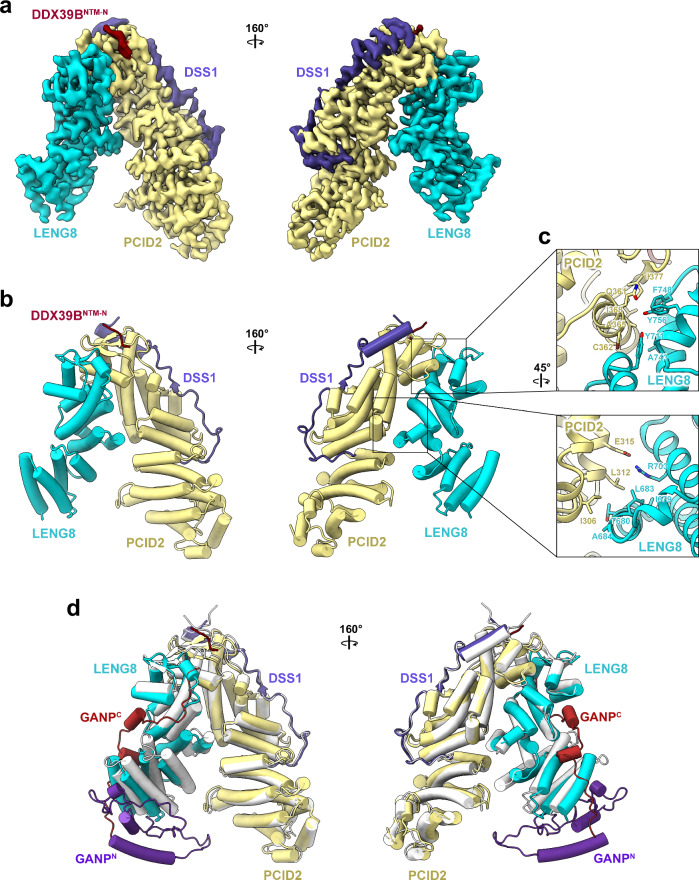 Nuclear export of mRNAs in the form of messenger ribonucleoprotein particles (mRNPs) is an obligatory step for eukaryotic gene expression. The DEAD-box ATPase DDX39B (also known as UAP56) is a multifunctional regulator of nuclear mRNPs. How DDX39B mediates mRNP assembly and export in a controlled manner remains elusive. Here, we identify a novel complex TREX-2.1 localized in the nucleus that facilitates the release of DDX39B from the mRNP. TREX-2.1 is composed of three subunits, LENG8, PCID2, and DSS1, and shares the latter two subunits with the nuclear pore complex-associated TREX-2 complex. Cryo-EM structures of TREX-2.1/DDX39B and TREX-2/DDX39B identify a conserved trigger loop in the LENG8 and GANP subunit of the respective TREX-2.1 and TREX-2 complex that is critical for DDX39B regulation. RNA sequencing from LENG8 knockdown cells shows that LENG8 influences the nucleocytoplasmic ratio of a subset of mRNAs with high GC content. Together, our findings lead to a mechanistic understanding of the functional cycle of DDX39B and its regulation by TREX-2 and TREX-2.1 in mRNP processing.