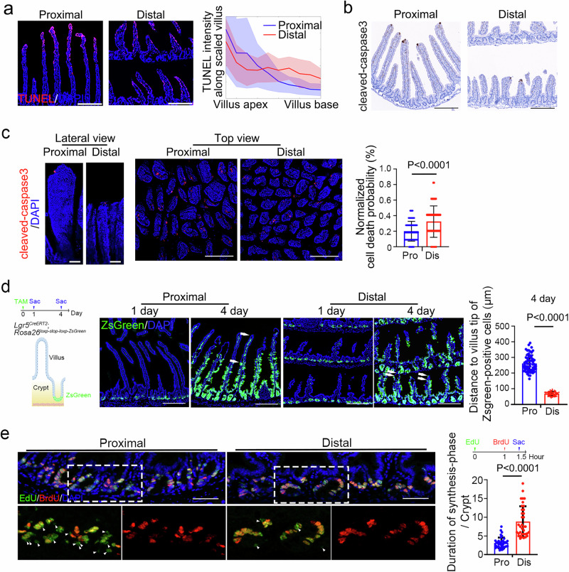 The intestinal epithelium undergoes fast turnover, and the villus length in the small intestine gradually decreases from the duodenum to the ileum. However, the underlying mechanisms remain poorly understood. In this study, we investigate the regulatory mechanism underlying the regional disparity of villus length. A progressive strengthening of BMP signaling from the duodenum to the jejunum and ileum establishes a signaling gradient, resulting in differences in the rates of cell proliferation and apoptosis. We show that BMP signaling regulates the survival of the small intestine epithelial cells by inhibiting integrin expression and thereby inducing cell apoptosis. Combined with mathematical modeling, our data reveal that BMP signaling provides positional cues and antagonizes Wnt signaling to control villus growth, while Wnt signaling promotes BMP signaling to counteract excessive proliferation, thus maintaining villus length. Our findings provide insights into the signaling dynamics governing epithelial turnover and villus length in the small intestine.