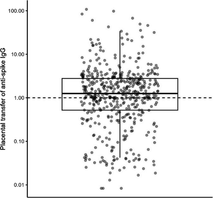 Conclusion: Placental transfer of SARS-CoV-2 antibodies was evident in a population of pregnant women whose immunity was primarily derived from infection given the low SARS-CoV-2 vaccine coverage in the study area. The positive correlation between maternal and cord blood anti-spike concentrations suggests that interventions that increase maternal antibody concentrations such as vaccination may increase passive immunity and protection against severe COVID-19 disease in neonates.