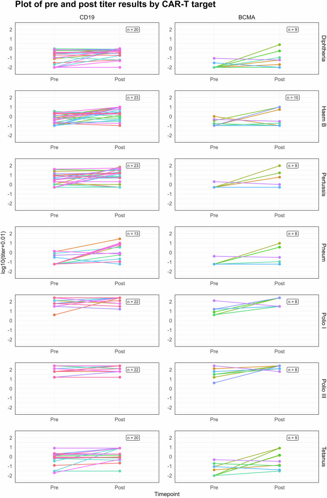 This single-center, retrospective study analyzed vaccine responses in patients who received post-Chimeric Antigen Receptor (CAR) T-cell therapy vaccination between 2018 and 2024. Vaccinations were administered according to EBMT/CIBMTR recommendations and pathogen-specific IgG responses to 12 vaccine-preventable infections were assessed. Seroprotection was defined by established cut-offs or a significant fold increase in titers. A total of 73 patients that had not received intravenous immunoglobulins within the eight weeks prior to pre- or post titer were included. The median time to vaccination initiation was 13 months (range 6-66) post-CAR T. Pre and post-vaccination titers were available for 49 patients. Pre-vaccination seroprotection was high (> 85%) for tetanus and poliovirus. Among patients not seroprotected prior to vaccination, vaccine response rates were high for tetanus and polio (100%), moderate for diphtheria (75%) and haemophilus influenzae type b (62%), and lower for pertussis (48%), hepatitis A (43%), hepatitis B (44%), and pneumococcal disease (33%). CD19 CAR T recipients had higher pre-vaccination seroprotection rates than BCMA recipients, but vaccine responses did not differ significantly between groups. Pre-vaccination IgA levels were significantly associated with vaccine response, and absolute B-cell counts trended higher among responders (p = 0.054). Our findings highlight the importance of immune reconstitution in vaccine responses post-CAR T.