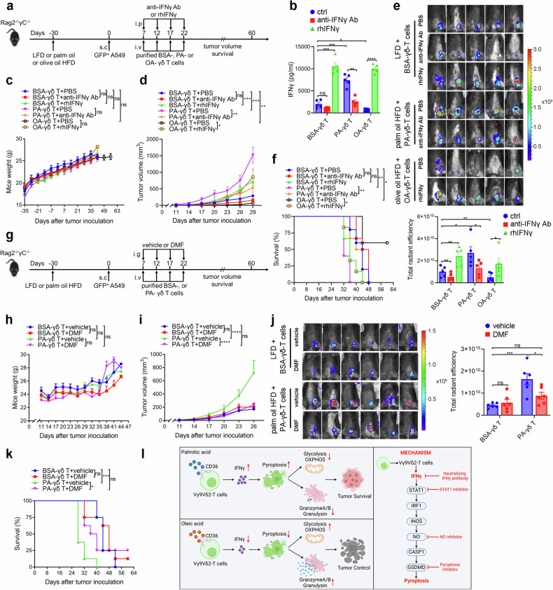 Dietary fatty acids (FAs) are associated with the therapeutic intervention under various health conditions. Human γδ-T cells are indispensable for immunosurveillance toward malignant cells. However, their impact on γδ-T cell metabolism and function remains poorly unexplored. Here, we applied targeted metabolomics analysis to serum FAs among cancer patients undergoing γδ-T cell therapy and discovered that palmitic acid (PA) or oleic acid (OA) levels were associated with the efficacy of Vγ9Vδ2-T cell therapy. We further elucidated that PA suppresses the antitumor activity of Vγ9Vδ2-T cells by disrupting metabolic processes and inhibiting the secretion of lytic granules, whereas OA restores the impaired antitumor activity of Vγ9Vδ2-T cells. Mechanistically, we surprisingly found that PA stimulates Vγ9Vδ2-T cells to secrete excessive IFNγ, which in turn induces cell pyroptosis, ultimately resulting in decreased antitumor activity. In contrast, OA reduces IFNγ secretion and mitigates cell pyroptosis, thereby restoring their antitumor activity. Alternatively, direct blockade of IFNγ by anti-IFNγ mAb or inhibition of pyroptosis by dimethyl fumarate (DMF) also restores their antitumor activity. This study highlights a novel mechanism whereby dietary FAs modulate γδ-T cell function through regulating IFNγ-mediated pyroptosis. Additionally, it offers proof-of-concept for an innovative approach by targeting IFNγ-mediated pyroptosis or dietary OA supplementation to strengthen the antitumor immunity of γδ-T cells against cancers.