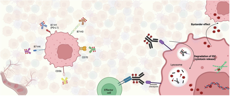 Immune-checkpoint targeting Drug Conjugates (IDCs) are a novel class of therapeutics that combine an immune checkpoint-targeting moiety, a cleavable linker, and a cytotoxic payload. By integrating features and functions of antibody-drug conjugates and immunotherapy, IDCs represent a promising strategy to remodel the tumor microenvironment and enhance antitumor efficacy. Several IDCs targeting checkpoints such as PD-L1, B7-H3, and B7-H4 are in early-phase clinical trials. This review summarizes available data on IDC efficacy and toxicity in human. Although current evidence is limited, ongoing phase III trials and biomarker studies will clarify their optimal clinical role, including potential for tumor-agnostic use.