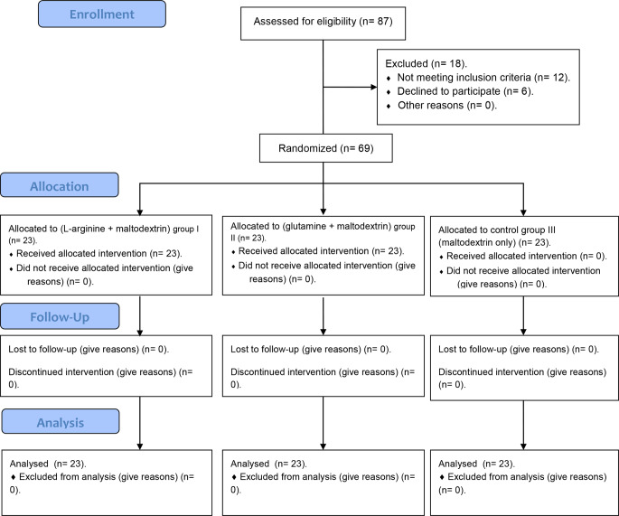 Methods: In this triple-blind, randomized controlled trial, 69 HNC patients with RIOM were allocated to three groups (n = 23 each): Group I (L-arginine 5 g + maltodextrin 5 g), Group II (glutamine 5 g + maltodextrin 5 g), or Group III (maltodextrin 10 g). Outcomes, assessed at weeks 2, 5, and 7 of radiotherapy, included the WHO oral mucositis scale, Pain Visual Analogue Scale (Pain-VAS), body mass index (BMI), and Oral Health Impact Profile (OHIP-14) questionnaire.
