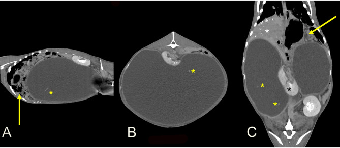 Case presentation: A four-year-old female alpaca was presented with a history of abdominal distension. Clinical signs included tenesmus with lifted tail, reduced fecal output and hypothermia. Initial ultrasound revealed severe accumulation of anechoic fluid in the abdomen and complete homogeneous soft tissue opacification of the abdomen was visible in radiography, with mass effect on all other abdominal organs. A CT scan confirmed a considerable cystic lesion in the caudal abdomen. Histopathological analysis of the cystic structure revealed mature connective tissue, both striated and smooth muscle, as well as gland-like formations. Immunohistochemical staining identified markers from multiple tissue types. Based on these findings, a diagnosis of mature retroperitoneal cystic teratoma was established.