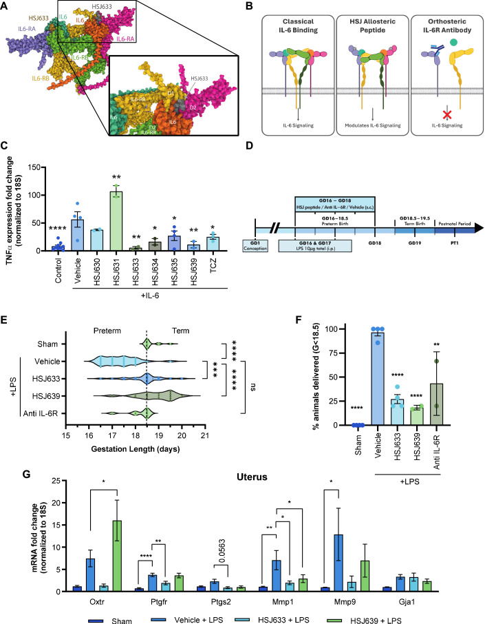 Preterm birth (PTB) is a major cause of neonatal mortality and morbidity. Evidence supports a determinant role for interleukin-6 (IL-6) in the pathophysiology of PTB. Our group developed a small peptide, HSJ633, that antagonizes the interleukin-6 receptor (IL-6R). Binding assays performed on HEK-Blue IL-6 cells reveal that HSJ633 appears to bind to IL-6R on a site remote from the IL-6 binding domain. Concordantly, HSJ633 selectively inhibits STAT3 phosphorylation while preserving the activation of cytoprotective AKT, p38, and ERK 1/2. In vivo, in a murine model of LPS-induced PTB, HSJ633 reduces inflammation in gestational and fetal tissues, preserves the integrity of fetal organs, and improves the survival of neonatal progeny when administered before and after the induction of labor by an inflammatory stimulus. Relevantly, the pharmacological inhibition of STAT3 in mice is sufficient to prevent PTB. Findings reveal first-in-class efficacy of a small peptide inhibitor of IL-6R, namely HSJ633, in impeding the inflammatory cascade associated with PTB and mitigating adverse neonatal outcomes.