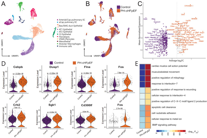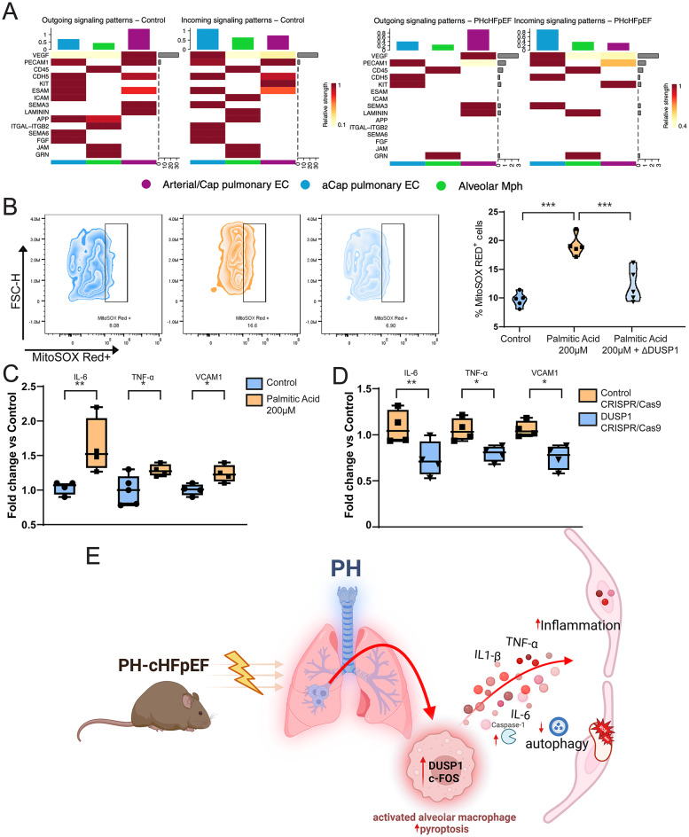 Results: Compared with control mice, PH-cHFpEF animals displayed right ventricular dysfunction, vascular remodeling and increased pulmonary pressure. SnRNA-seq of mouse lungs revealed transcriptional alterations in AMs, with a significant reduction in their abundance in PH-cHFpEF mice. These changes were associated with dysregulation of transcriptional programs involved in pyroptosis, defective autophagy and inflammation in AMs from PH-cHFpEF vs. control mice, as shown by the upregulation of c-Fos, Dusp1, Pim-1 and Ccn1. STRING analysis revealed a molecular link between these partners and highlighted c-Fos/Dusp-1 as a central axis of AMs cell death and inflammation. Metabolic stress induced by PA in isolated murine macrophages recapitulated c-Fos/Dusp-1 activation as well as IL-1β, TNF-α, and Caspase-1 upregulation resulting in inflammation, impaired autophagy and enhanced pyroptosis. Moreover, c-Fos/Dusp1 activation in macrophages promoted secretion of pro-inflammatory chemokines leading to endothelial dysfunction in a paracrine manner. Dusp1 knockdown rescued autophagy and pyroptosis while mitigating macrophage-driven inflammation and endothelial damage.