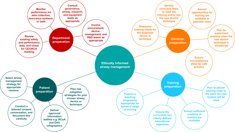 Practitioners involved in airway management must balance ethical issues in their practice. Ethical tensions exist because clinicians must maintain clinical standards while maximising skill development, exploring advances in airway practice, and incorporating new learning to benefit future patients. Balancing the benefits and risks to the patient and choosing the right techniques in the right situations and with the right level of patient understanding and respect for patient autonomy can be challenging. These challenges are shared by airway practitioners from many professional backgrounds; however, this document has been developed specifically to support anaesthetists in their airway management decisions, and for simplicity, the term 'anaesthetists' will be used throughout the document. However, the ethical considerations will have relevance to all airway practitioners. Practice combined with training is central to professional development. Most patients are aware that training is entwined with care and trust anaesthetists to deliver this safely. Trainers should use airway teaching methods appropriate to the trainee's needs and skills. Informed consent is required for airway management, and the level of detail should be proportionate to the risks involved. Patients have individual preferences and appreciation of risks, so these conversations must be individualised. Anaesthetists should support the development of new airway devices and techniques. New methods must be assessed within governance structures, and it may be appropriate to collect data or feedback as part of the introduction to practice. Ethical practice requires doing what is best, doing it openly, honestly, and in patients' interests. The modern ethical and legal landscape has emphasised patient information, discussion, and documentation. We hope this position statement provides guidance, structure, and clarity for the benefit of our patients and our specialty.