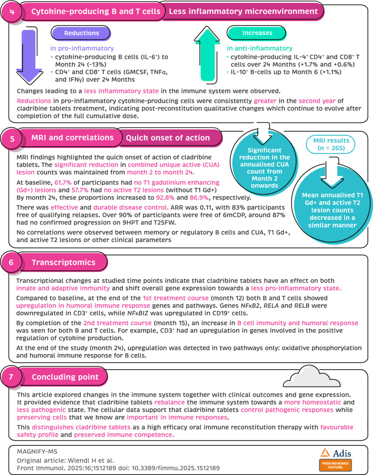 Cladribine tablets (CladT) for relapsing multiple sclerosis help reset the immune system with short treatment courses over 2 years. This analysis of MAGNIFY-MS contrasted clinical outcomes with changes in immune cells, proteins and genes over 2 years in 270 participants. Most immune cells decreased 3 months after starting CladT. Gradual recovery was seen in naïve, regulatory, and transitional B cells starting at month (M)3 and M6. Gene activity related to immune response changes was also reported. Fewer cells producing pro-inflammatory signals and more cells producing anti-inflammatory signals were detected by M24. Immunoglobulin levels mostly remained normal, and a marker of neuroaxonal damage (serum neurofilament light chain) was decreased. Significant reductions in lesion count occurred from M2 onwards. Annualised relapse rate was 0.11 (95% confidence interval: 0.09, 0.15). Over 90% of participants were free of 6-month confirmed disability progression, around 87% had no confirmed progression on 9-hole peg test and timed 25-foot walk. No significant correlations were seen between clinical parameters and lymphocyte dynamics. The safety profile was consistent with previous studies. These findings provide evidence of CladT rebalancing the immune system towards a more homeostatic and less pathogenic state.