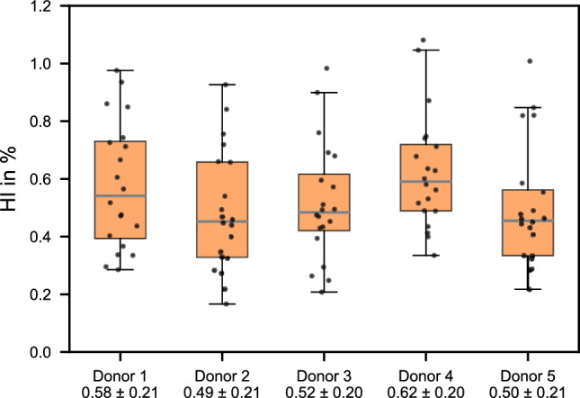 Purpose: Numerical hemolysis models rely on experimental data to fit parameters and predict hemolysis under various conditions. However, existing experiments often use few replicates per condition, leaving inherent variability largely unaddressed. This can lead to oversimplified models that fail to capture the true nature of hemolysis. Here, we quantify intra- and inter-donor variability at a single, well-defined shear stress and exposure time and examine how sample size affects measurement precision METHODS: Human blood from five healthy donors was subjected to a fixed shear stress and exposure time condition. For each donor, 20 independent measurements were performed to calculate a hemolysis index (HI). Intra-donor variability (variation within a single donor's measurements) and inter-donor variability (variation between donor means) were compared. Additionally, bootstrap analyses were used to explore the effect of the sample size on the confidence intervals of the mean HI.