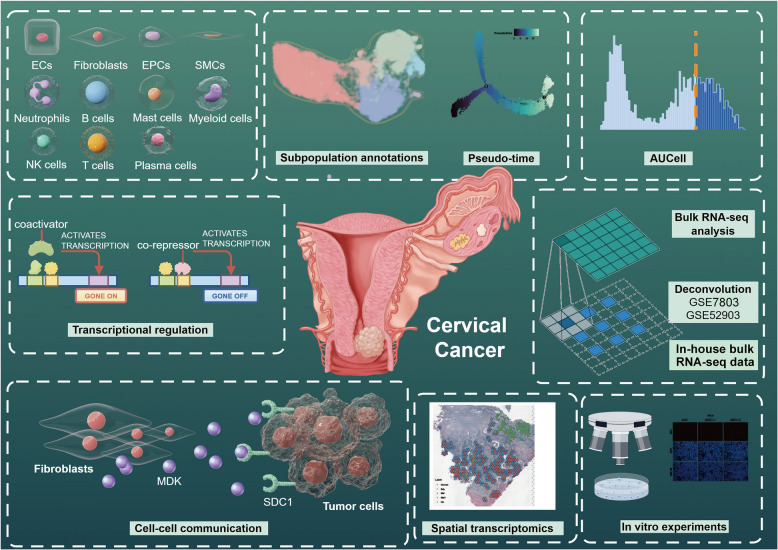 Results: Six distinct fibroblast subtypes were identified, including the C0 MYH11 + fibroblasts, which exhibited unique roles in stemness maintenance, metabolic activity, and immune regulation. Spatial and functional analyses revealed that the C0 subtype is central to tumor-fibroblast interactions, particularly through the MDK-SDC1 signaling axis. The prognostic model incorporating fibroblast-specific markers demonstrated robust predictive power for patient survival outcomes. Additionally, in vitro SDC1 knockdown significantly inhibited CC cell proliferation, migration, and invasion. Fibroblasts show spatially regulated heterogeneity, with activation markers enriched in the tumor zone and MYH11 highest in normal zones, indicating dynamic stromal remodeling. C0 MYH11 + CAF Promotes Tumor Cell Proliferation, Migration, and Inhibits Apoptosis via Soluble SDC1.
