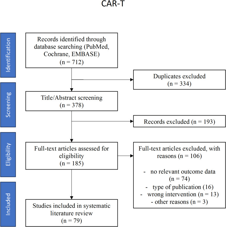 Methods: We performed a systematic literature review to identify factors impacting the efficacy and safety of CAR-T therapies in DLBCL. Articles were searched in PubMed, Cochrane, and EMBASE databases. Key outcomes, including progression-free survival (PFS), overall survival (OS), complete response rate (CRR), objective response rate (ORR), duration of response (DoR), best overall response (BOR), and safety measures (e.g., Immune Effector Cell-Associated Neurotoxicity Syndrome [ICANS], and Cytokine Release Syndrome [CRS]), were extracted according to PRISMA guidelines. A total of 712 articles were identified, with 185 selected for full-text screening. Ultimately, 79 articles met inclusion criteria. Exclusions were primarily due to the absence of relevant outcome data or publication type.