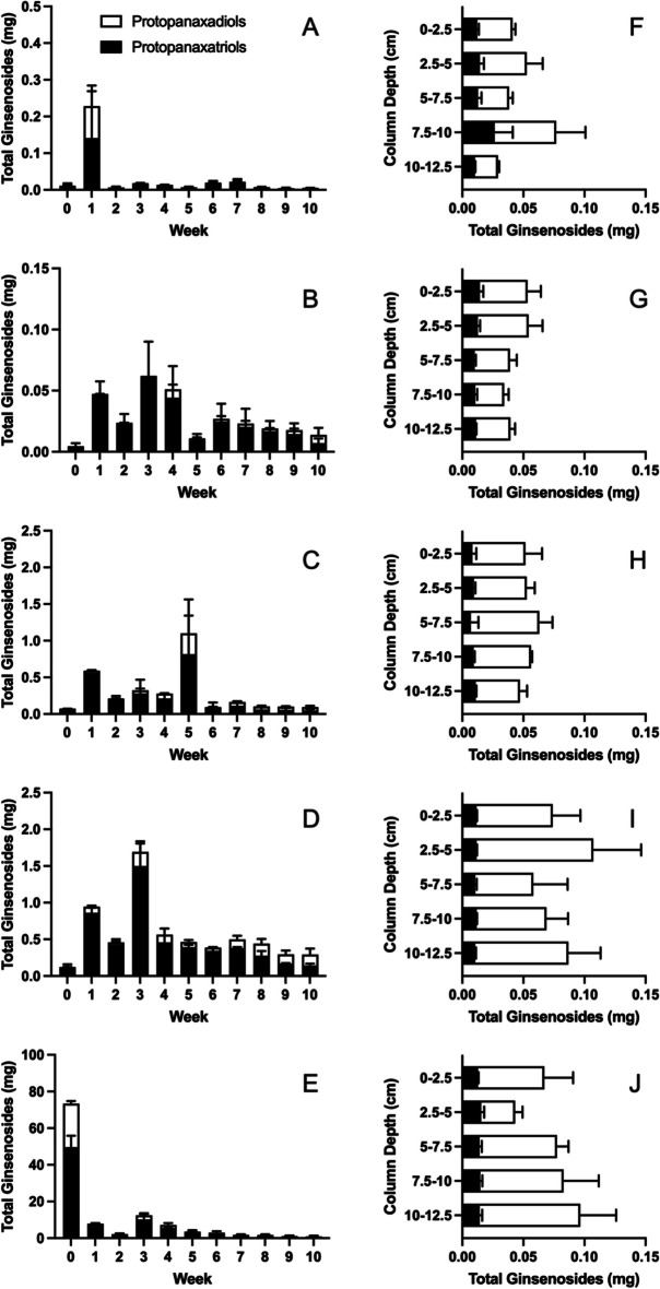 Results: Ginsenosides accumulate throughout the first three and a half years of ginseng cultivation and decline during the fourth year. Residual ginsenosides present in garden soil at the time of harvest are largely gone by the following spring. Soil column data revealed that sandy-loam soil has capacity to bind and retain ginsenosides, and that protopanaxatriol-type ginsenosides are more mobile than the protopanaxadiol-type.