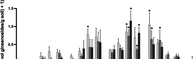 Conclusion: Ginsenosides accumulate in ginseng garden soil during cultivation, but do not persist. Our data suggest that the impact of ginsenosides on the establishment of GRD occurs during crop growth rather than during the time between plantings.