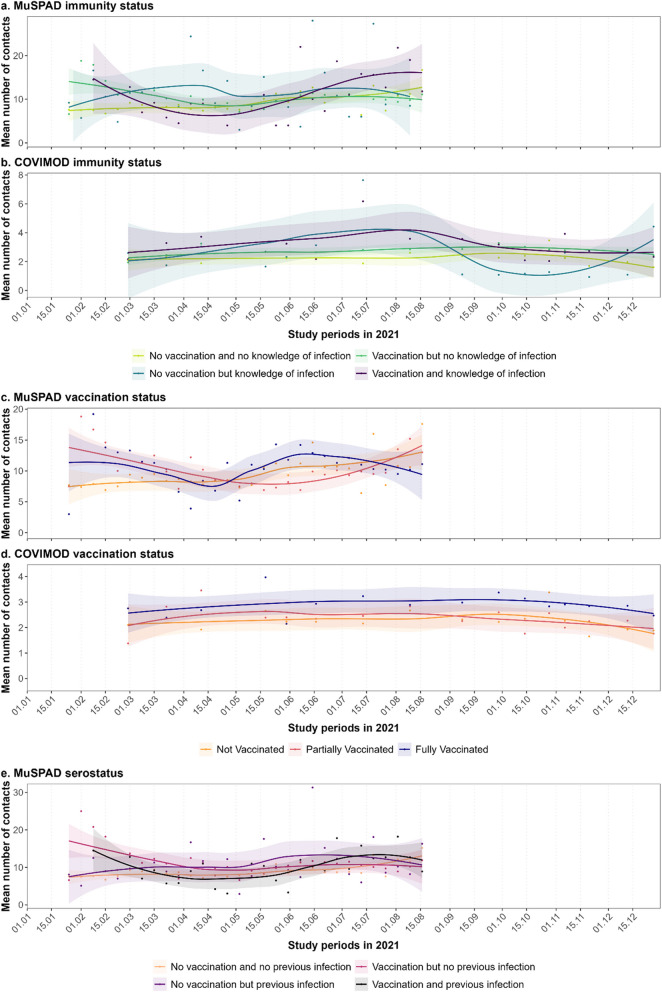 Conclusions: Different contact behaviours based on infection and/or vaccination status suggest that public health policies targeting immunity status may influence the contact behaviour of those affected. A combined assessment of self-reported contacts, infections, and vaccinations as well as laboratory-confirmed serostatus in the population can support modelling of the spread of infections. This could help target containment policies and evaluate the impact of public health measures.