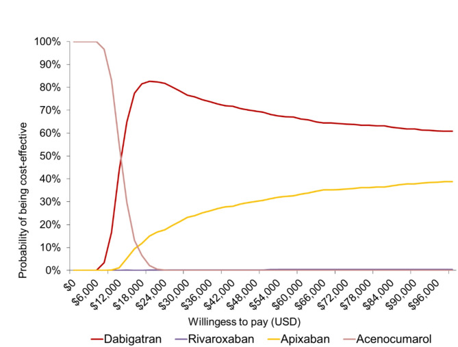 Results: Dabigatran was the most (cost-)effective among all alternatives (8.53 QALYs). Considering the Chilean cost-effectiveness threshold of USD 17,200 (1 GDP per capita), dabigatran was cost-effective (USD 11,042 per QALY gained), while both rivaroxaban and apixaban were dominated by dabigatran. Regarding the second-order uncertainty, at the suggested threshold, dabigatran exhibit the highest probability of being cost-effective (approximately 60%). In the reversal agent scenario, dabigatran plus idarucizumab was also found to be cost-effective in the Chilean context.
