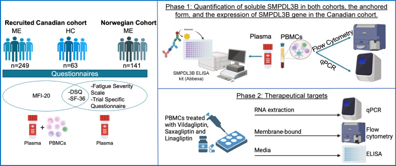 Methods: A case-control study was conducted in two independent cohorts: a Canadian cohort (249 ME patients, 63 controls) and a Norwegian replication cohort (141 ME patients). Plasma and membrane-bound SMPDL3B levels were quantified using ELISA and flow cytometry. Gene expression of SMPDL3B and PLCXD1, encoding phosphatidylinositol-specific phospholipase C (PI-PLC), was analyzed by qPCR. The effects of dipeptidyl peptidase-4 (DPP-4) inhibitors-vildagliptin, saxagliptin, and linagliptin-on modulation of membrane-bound and soluble SMPDL3B were assessed in vitro by qPCR, flow cytometry and ELISA.