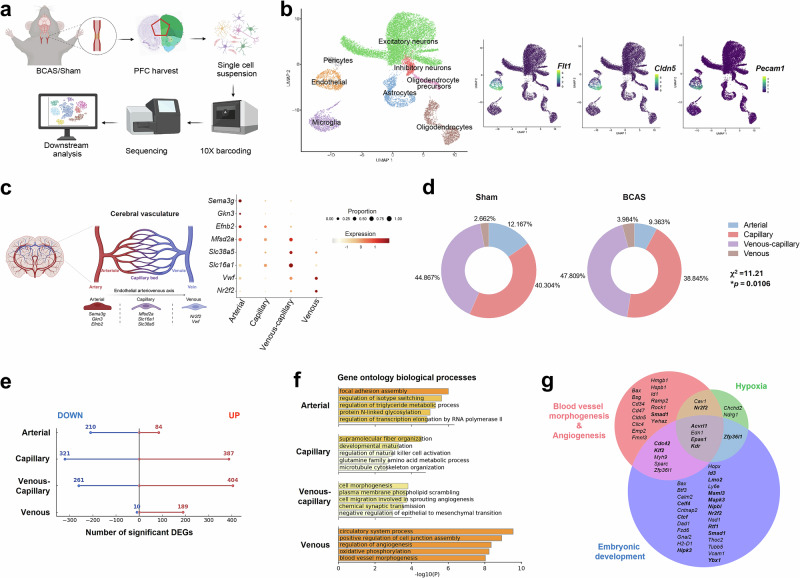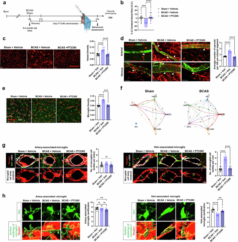 Vascular dementia is the second most common form of dementia. Yet, the mechanisms by which cerebrovascular damage progresses are insufficiently understood. Here, we create bilateral common carotid artery stenosis in mice, which effectively impairs blood flow to the brain, a major cause of the disease. Through imaging and single-cell transcriptomics of the mouse cortex, we uncover that blood vessel venous cells undergo maladaptive structural changes associated with increased Epas1 expression and activation of developmental angiogenic pathways. In a human cell model comparing arterial and venous cells, we observe that low-oxygen condition leads to sustained EPAS1 signaling specifically in venous cells. EPAS1 inhibition reduces cerebrovascular abnormalities, microglial activation, and improves markers of cerebral perfusion in vivo. In human subjects, levels of damaged endothelial cells from venous vessels are correlated with white matter injury in the brain and poorer cognitive functions. Together, these findings indicate EPAS1 as a potential therapeutic target to restore cerebrovascular integrity and mitigate neuroinflammation.