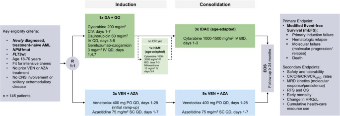 - Döhner H, Weber D, Krzykalla J, Fiedler W, Kühn MWM, Schroeder T, Mayer K, Lübbert M, Wattad M, Götze K, Fransecky L, Koller E, Wulf G, Schleicher J, Ringhoffer M, Greil R, Hertenstein B, Krauter J, Martens UM, Nachbaur D, Samra MA, Machherndl-Spandl S, Basara N, Leis C, Schrade A, Kapp-Schwoerer S, Cocciardi S, Bullinger L, Thol F, Heuser M, Paschka P, Gaidzik VI, Saadati M, Benner A, Schlenk RF, Döhner K, Ganser A, Kühn MWM, Wattad M, Martens UM, Gaidzik VI, Schlenk RF (2023) Intensive chemotherapy with or without Gemtuzumab Ozogamicin in patients with NPM1-mutated acute myeloid leukaemia (AMLSG 09–09): a randomised, open-label, multicentre, phase 3 trial. Lancet Haematol 10:e495–e509. 10.1016/S2352-3026(23)00089-3 - PubMed