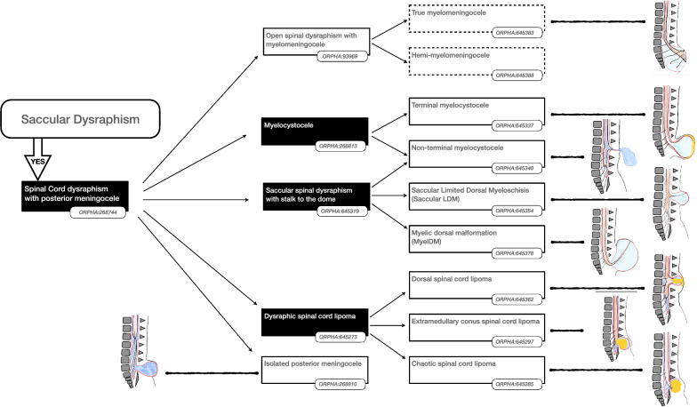 Conclusions: An update of the Orphanet Classification of spinal dysraphism was conducted by a European interdisciplinary group of experts encompassing all aspects of healthcare for patients with these disorders. This new classification, based on essential skin, bone and spinal cord findings offers a more logical and reproducible means to categorise SBoD. It is hoped that this will permit more precise disease delineation, consistent diagnostic accuracy and better prognostication.