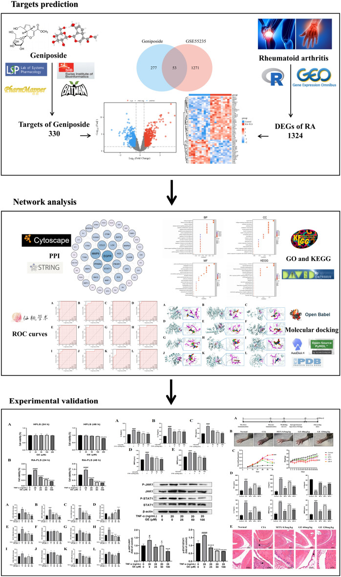 Rheumatoid arthritis (RA) is a chronic autoimmune disease that affects millions worldwide, characterized by joint pain, swelling, and functional impairment. Current treatments like Non-steroidal anti-inflammatory drugs (NSAIDs), corticosteroids, and biologics, have limitations including side effects and resistance problems, which create a need for new therapeutic strategies. This study aims to explore the potential therapeutic role and mechanisms of Geniposide (GE), a natural compound extracted from Gardenia jasminoides, in RA treatment. Through network pharmacology methods and using target prediction databases including TCMSP, SwissTargetPrediction, Pharmmapper, and Batman, 330 potential targets of GE were identified. In RA, 1324 differentially expressed genes (DEGs) were identified from the GSE55235 dataset. By intersecting the datasets, 53 shared targets were identified, which were further analyzed using Gene Ontology (GO) and Kyoto Encyclopedia of Genes and Genomes (KEGG) enrichment, with pathways like IL-17 and JAK-STAT being significantly highlighted. Additionally, protein-protein interaction (PPI) network analysis identified 12 key targets (EGFR, MMP-9, CCL5, PPARG, STAT1, HCK, SYK, MAPK8, CTSB, RAC2, JAK2, TYMS) with high degree values. Furthermore, molecular docking studies confirmed strong binding affinities between GE and the identified targets. Experimental validation demonstrated that GE inhibited RA-FLS cell proliferation in a dose-dependent manner by using MTT assays and reduced the level of pro-inflammatory cytokines (IL-17, IL-8, TNF-α, MMP-3, MMP-9) as measured by ELISA. RT-qPCR and Western blot analyses further confirmed that GE modulated the mRNA expression of key targets and inhibited the phosphorylation of JAK1 and STAT1 proteins, respectively. Finally, we verified the anti-inflammatory effect of GE on CIA mice through in vivo experiments. These findings suggest that GE has anti-RA effects by targeting several key molecules and pathways. This provides a theoretical basis for developing GE as a novel therapeutic for RA.