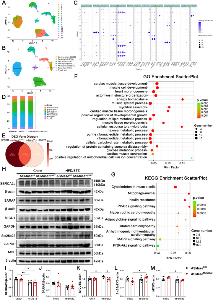 Methods and results: We established a type 2 diabetes model by combining high-fat diet (HFD) with streptozotocin (STZ) injection in wild-type and cardiomyocyte-specific ASMase deletion (ASMaseMyh6KO) mice. ASMase deletion restored HFD/STZ-induced cardiac dysfunction, remodeling, myocardial lipid accumulation and apoptosis. Single cell sequencing and Gene ontology (GO) enrichment analysis pointed to "cardiac muscle contraction" and "positive regulation of mitochondrial calcium ion concentration", which were confirmed by high glucose (HG, 30 mM) and palmitic acid (PA, 200 μM) induced mitochondrial Ca2+ overload in H9c2 cell lines at time dependence, accompanied by the upregulation of ASMase and MICU1 protein expressions. The similar effects were noted in ASMase overexpressed cardiomyocytes. Interestingly, endoplasmic reticulum (ER) Ca2+ level was decreased at the corresponding time, suggesting that increased mitochondrial Ca2+ level may be derived from ER. Notably, enhanced MAMs formation was found in HG + PA treated H9c2 cells, accompanied by blocked autophagy, similar results were obtained in ASMase overexpressing cells or HFD/STZ hearts. Loss of ASMase prevented HFD/STZ or HG + PA incubation induced cardiac hypertrophy, mitochondrialCa2+ overload, ROS production, autophagy blockage and MICU1 upregulation.